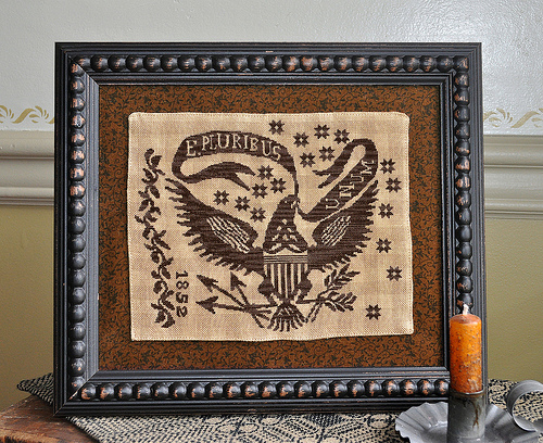 Are all of us stitchers alike in this? Even when we're contently stitching one project, in a little corner of our minds lies an image of a new chart we saw. We can't get that image to go away. For instance, just this week my friend in stitching and Facebook friend, Jenetta, posted a photo of the chart "E Pluribis Unum" by Summer House Stitche Workes and now I need it. I can imagine this hanging in our office - it would look so good there.